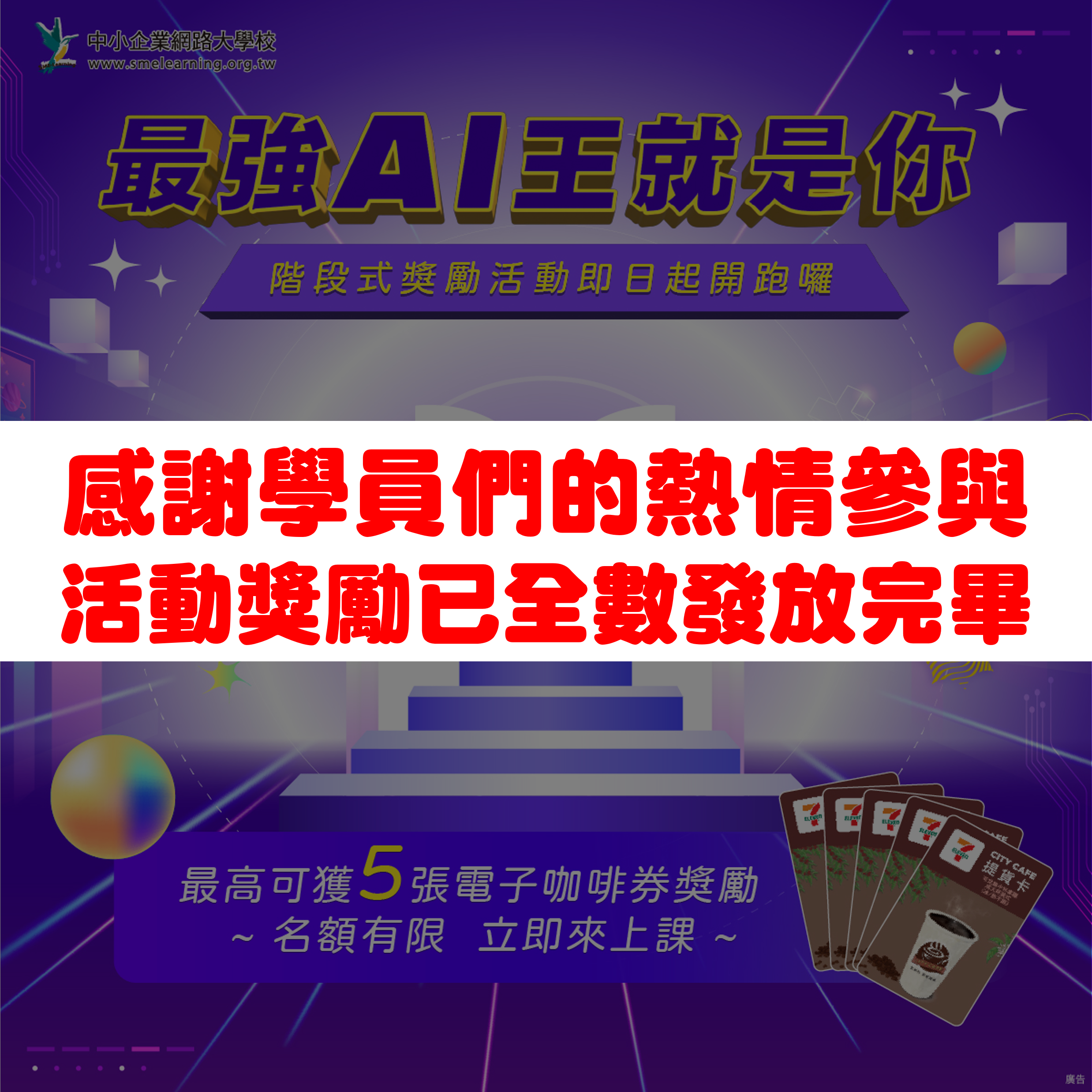 感謝各位學員熱情參與!本年度「最強AI王」活動二階段獎勵名額已全數額滿。
