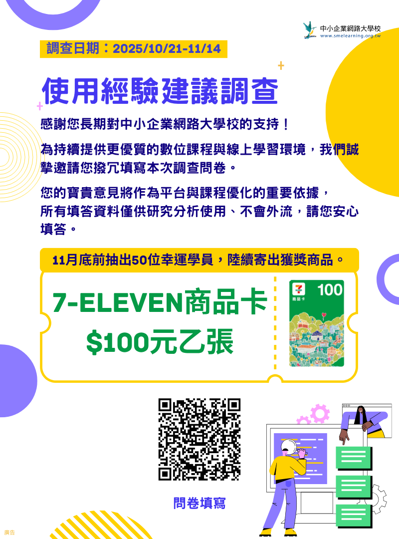 - 主辦單位預計於2025/11/30前(遇休息日順延至下個工作日)公布中獎名單於中小企業網路大學校最新消息,主辦單位將於2025/12/31前寄出獎品,如因您提供錯誤資料或資料不全致無法領獎,主辦單位恕不補發。
