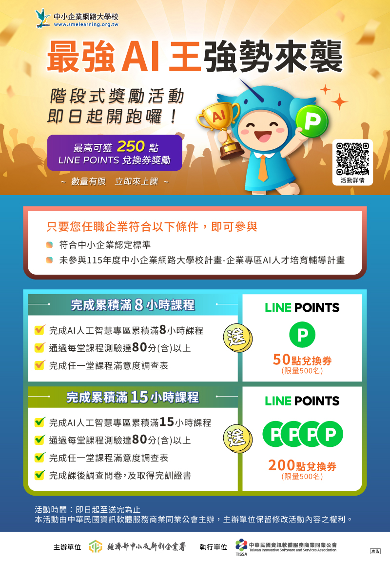 【最強AI王強勢來襲】完成8小時及15小時AI主題專區課程並通過課程測驗,最多可獲得250點LINE POINTS兌換券,數量有限,立即上課!
